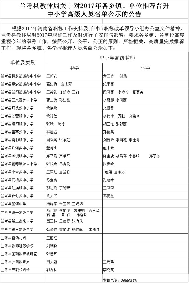 2017年各乡镇、单位推荐晋升中小学高级人员名单公示的公告