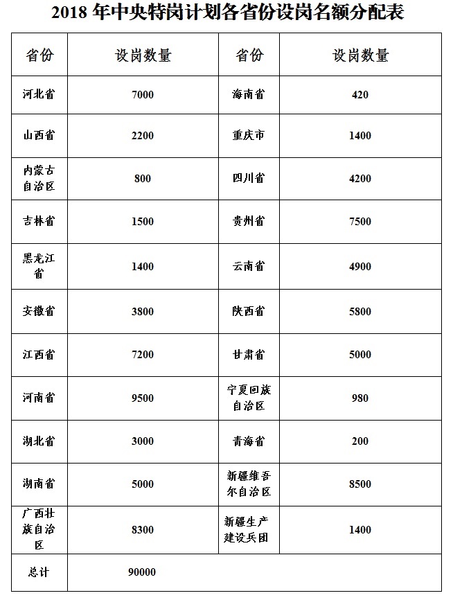 (二)招聘数量。2018年全国计划招聘特岗教师9万名,各省(区、市)招聘名额见《2018年中央特岗计划各省份设岗名额分配表》(附件1)。