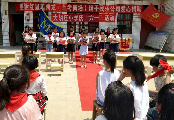 进一步改善办学条件,为学生们创造了良好的学习环境,2018年6月1日,兰考红星美凯龙携手我乐橱柜向考城镇大胡庄小学捐赠55套课桌凳。考城镇副镇长王玉江,中心校蔡永顺专干参加活动。