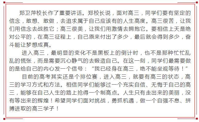 2018年6月18日早上6点,兰考一高校园里,掌声雷动,士气冲天,高二学子在郑卫萍校长和符建杰副校长的带领下,发出挺进高三的阵阵呐喊!