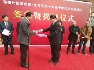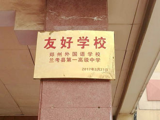 郑州外国语学校校长王中立在讲话中表示,双方缔结友好学校以后,对兰考一高提供中层以上领导培训、班主任培训,教师专业发展培训、学生学业指导、教师结对等方面的帮助,支持兰考一高各阶段部分优秀学生到郑州外国语学校插班学习。协助兰考一高教师学习先进的教学理念,提高业务水平,研究提高教育教学的对策,共同促进兰考一高教育再上新台阶。